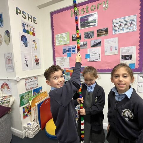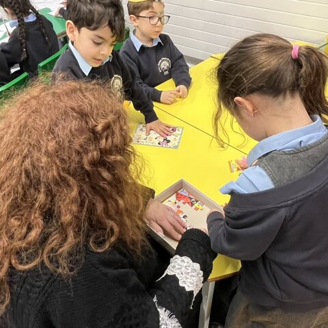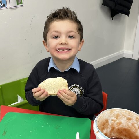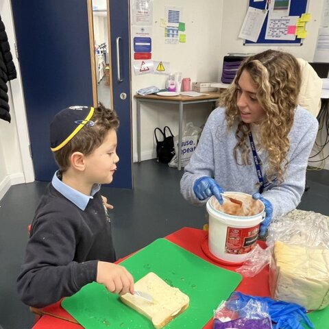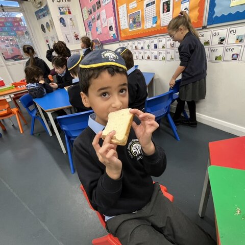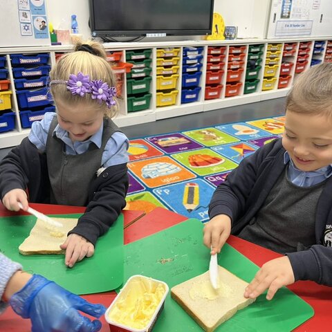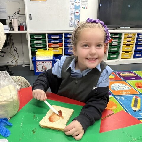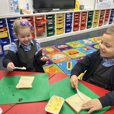 Year 1 are looking at the features of instructional writing in English (using a verb, headings and time conjunctions) via a carousel of different activities. They were making jam sandwiches, following a clear set of instructions. They were also drawing a picture of a dog and giving instructions to a friend, working together they were making a tower of cubes and also following the instructions in a game of snakes and ladders. Lots of instructions being given and being listened to. They will be putting this learning to good use in their next long write.
