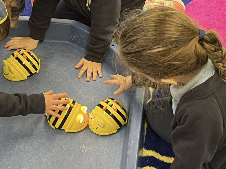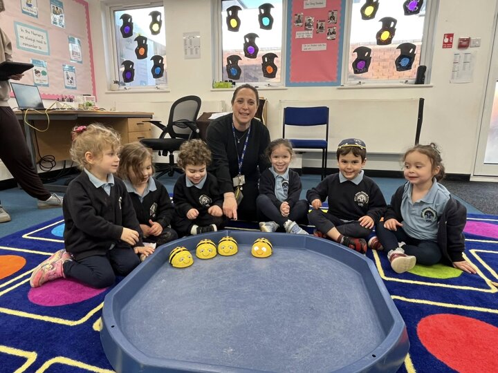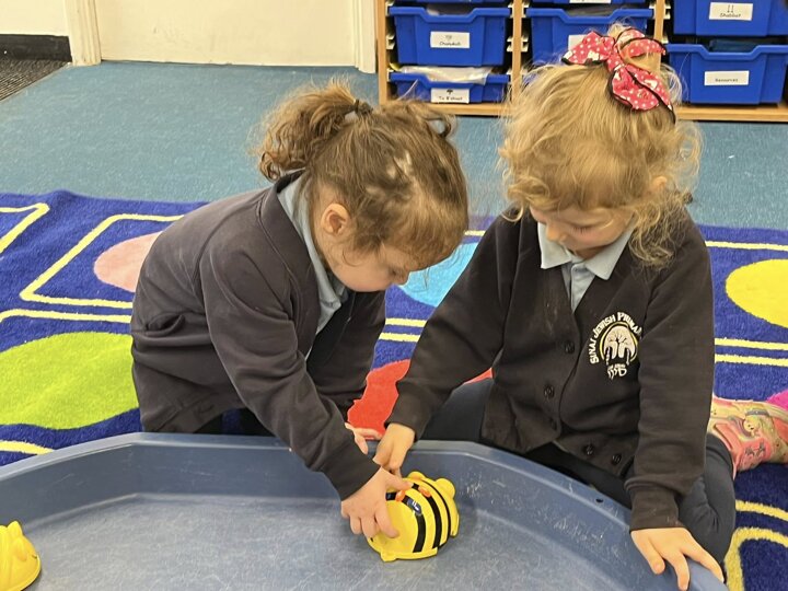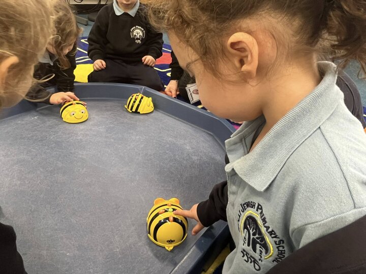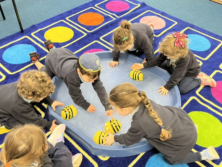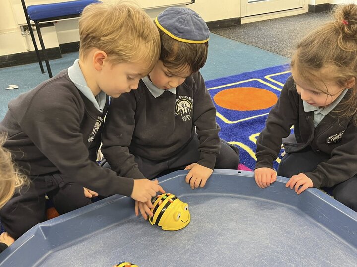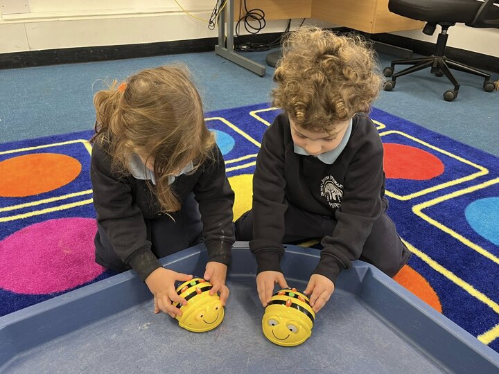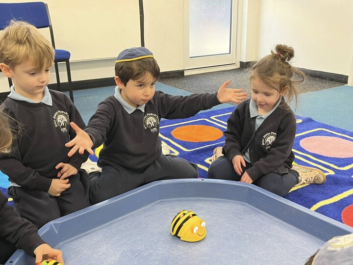 Our Nursery children were really enjoying our Bee-bot floor robots. The children were programming simple sequences of forwards, backwards, left and right and watching the bees moving around.