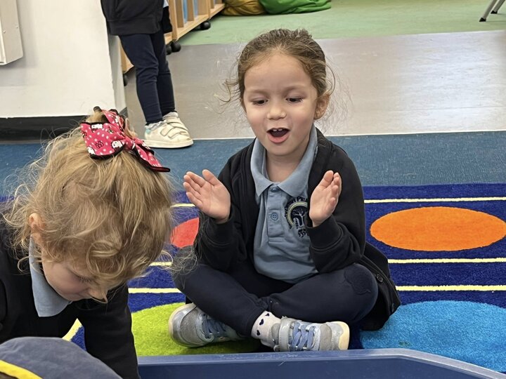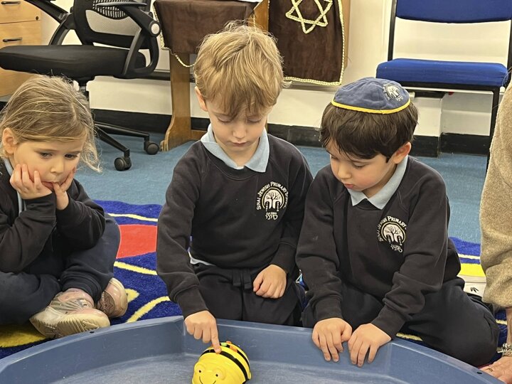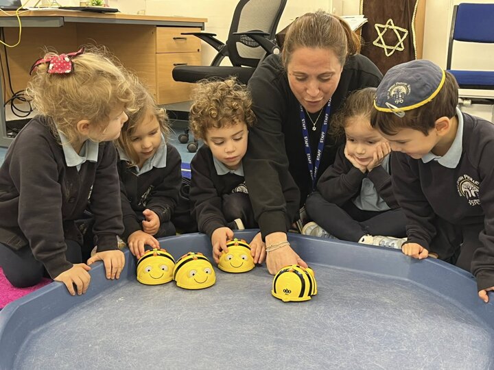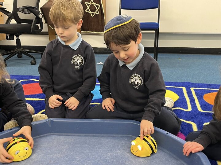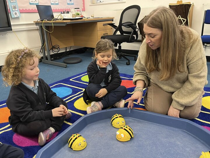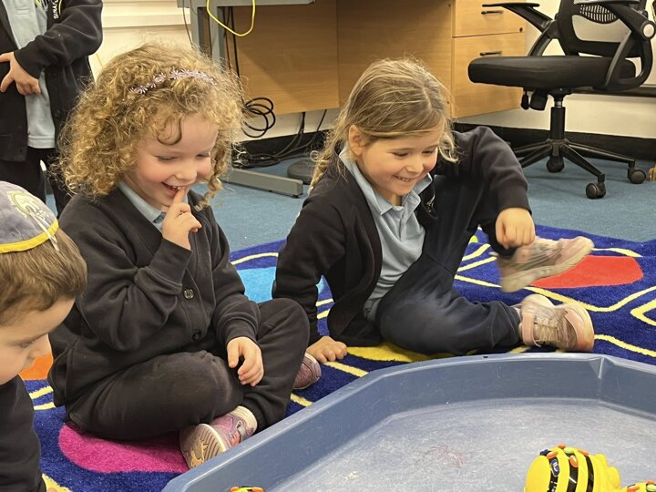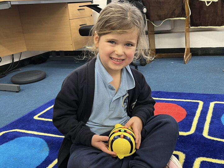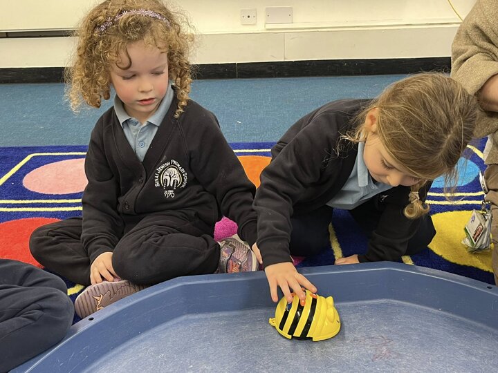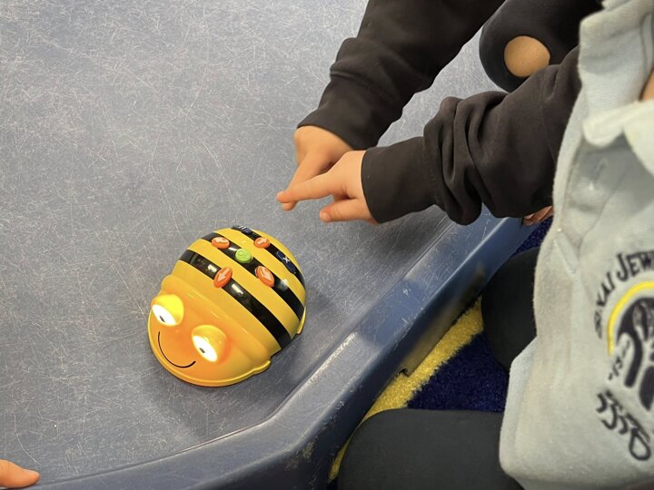 Our Nursery children were really enjoying our Bee-bot floor robots. The children were programming simple sequences of forwards, backwards, left and right and watching the bees moving around.