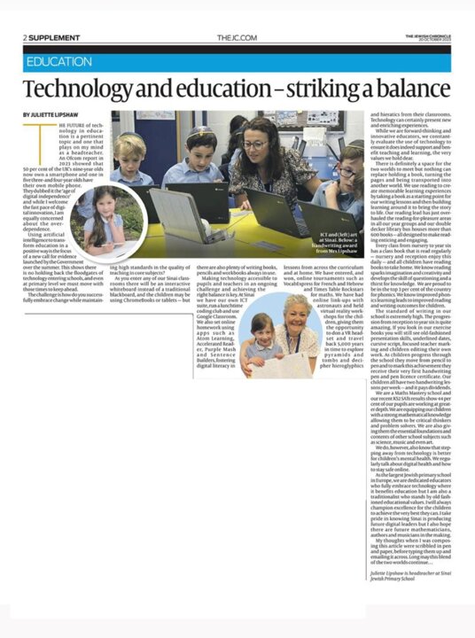 As the largest Jewish primary school in Europe, we are dedicated educators who fully embrace technology where it benefits education but I am also a traditionalist who stands by old fashioned educational values. I will always champion excellence for the children to achieve the very best they can. I take pride in knowing Sinai is producing future digital leaders but I also hope there are future Mathematicians, authors and musicians in the making.