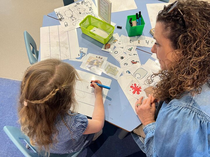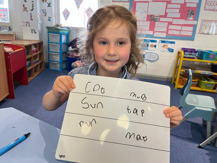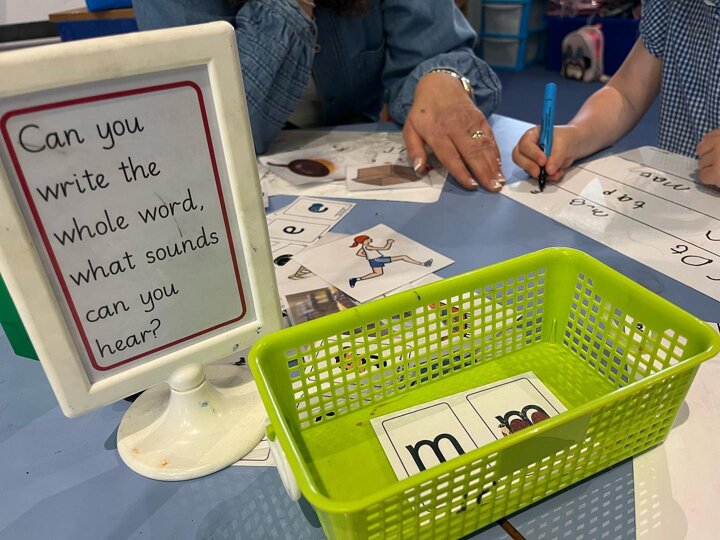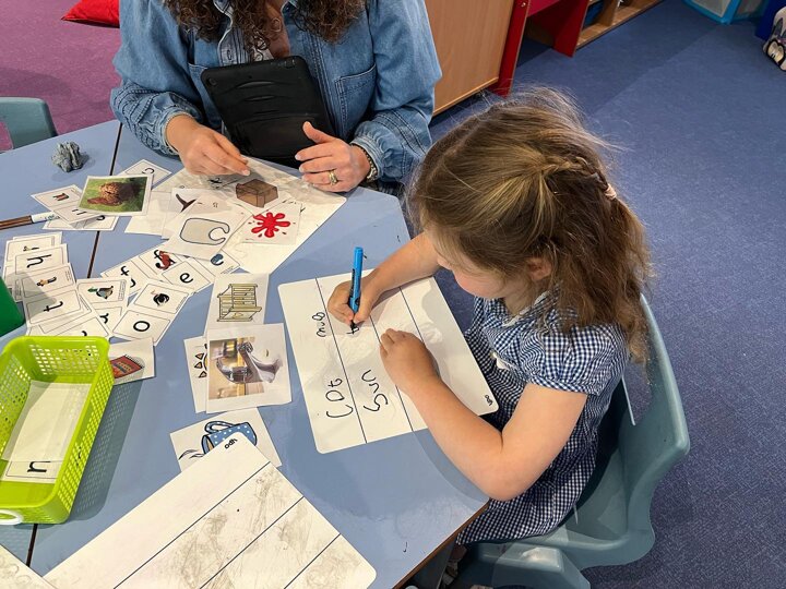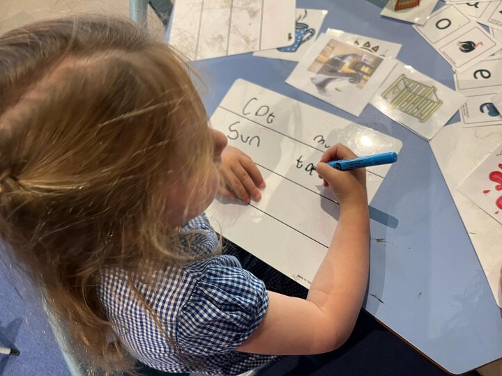 Just look at the progress made this year at our Nursery writing table. This child is doing independent writing, using picture cards, to write out CVC (consonant, vowel, consonant) words. This was a 1:1 intervention with a key worker - and Mrs Tapper is looking on very proudly.