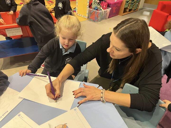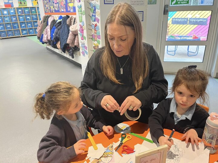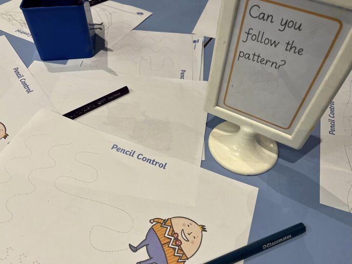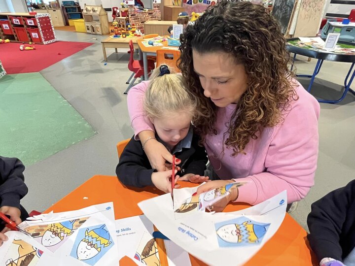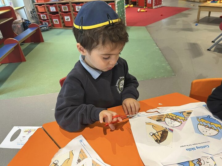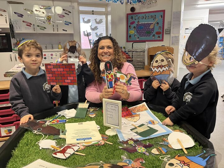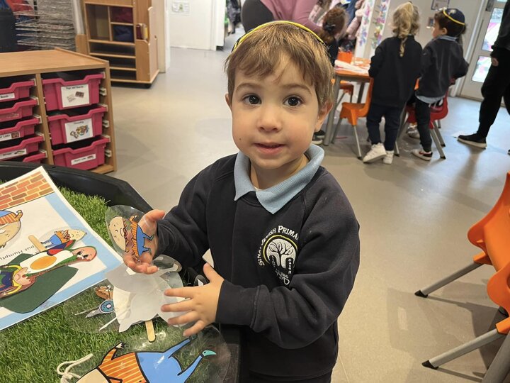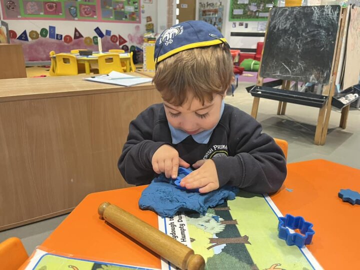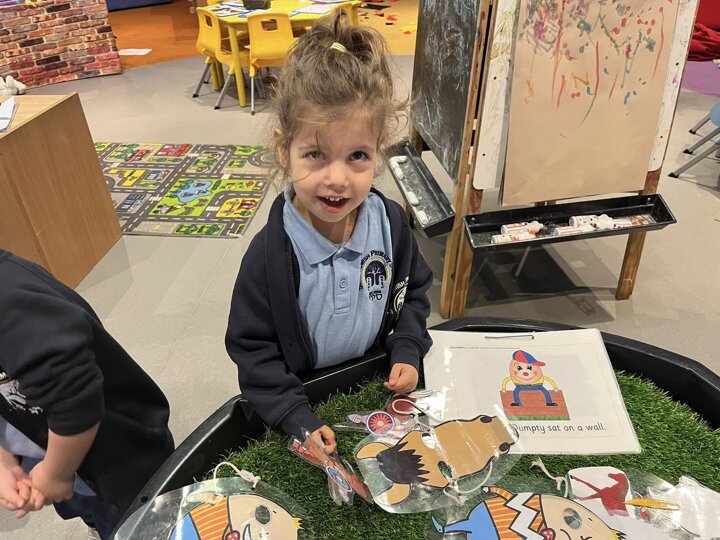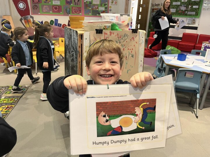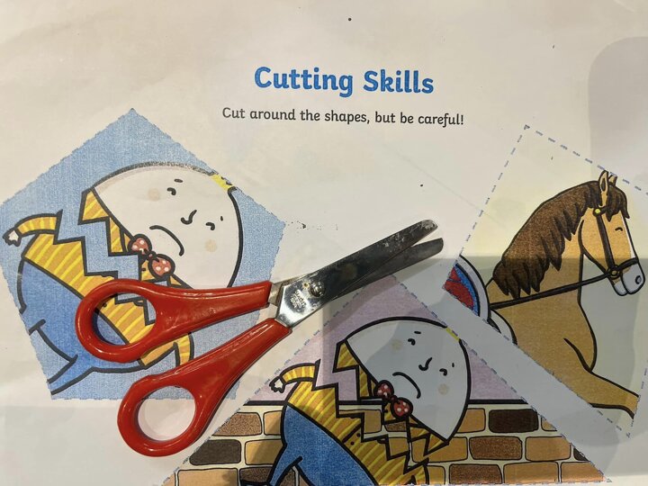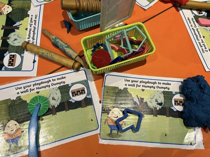 Our Nursery children are looking at Nursery Rhymes and today are exploring all things Humpty Dumpty. They are cutting Humpty Dumpty to improve their fine motor skills, learning pencil control, using playdoh to strengthen their hand muscles and playing with the masks and puppets in the tuff tray.