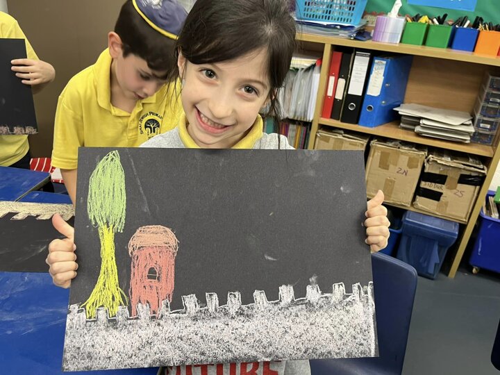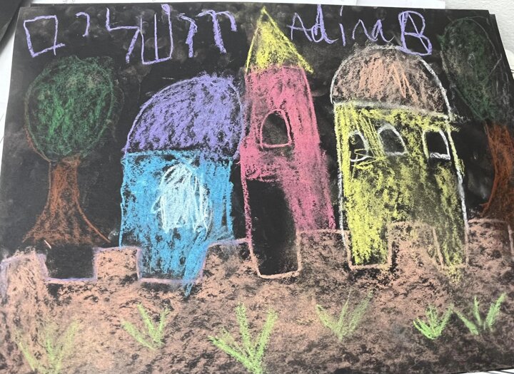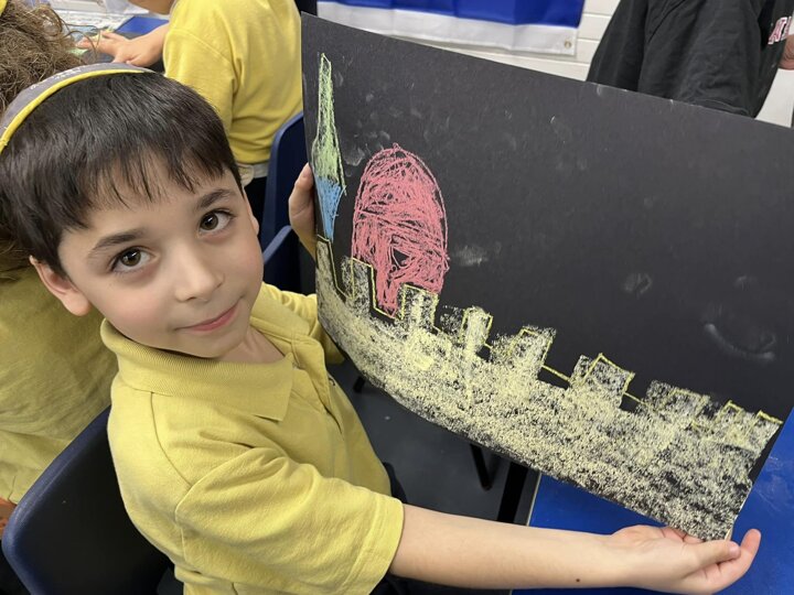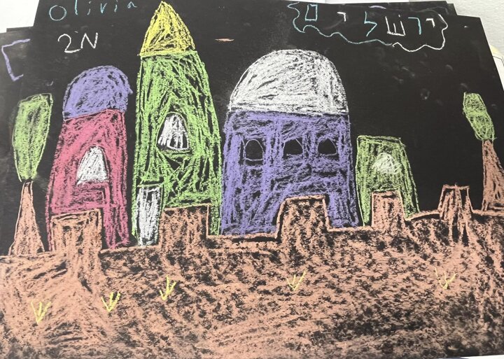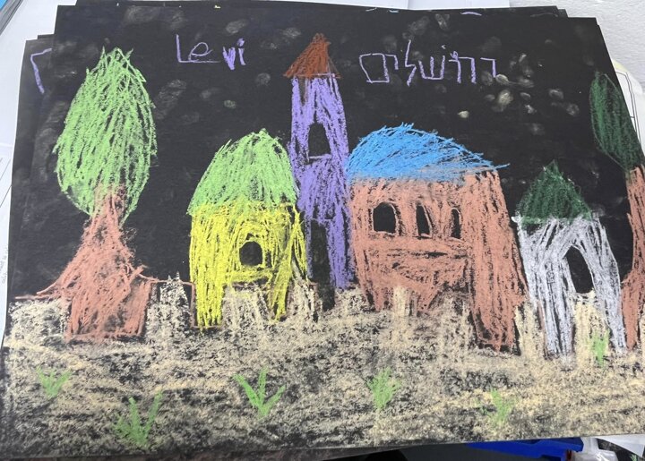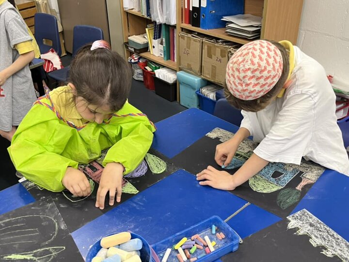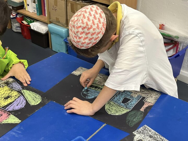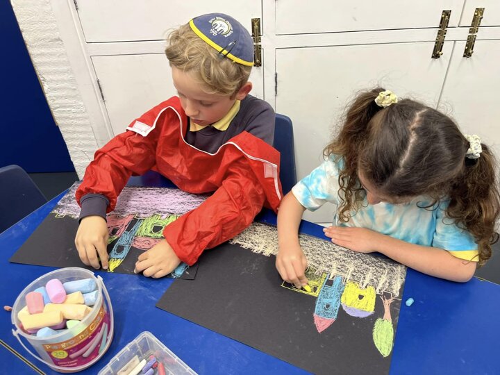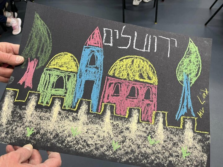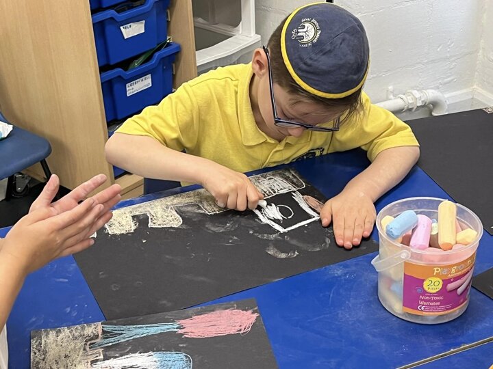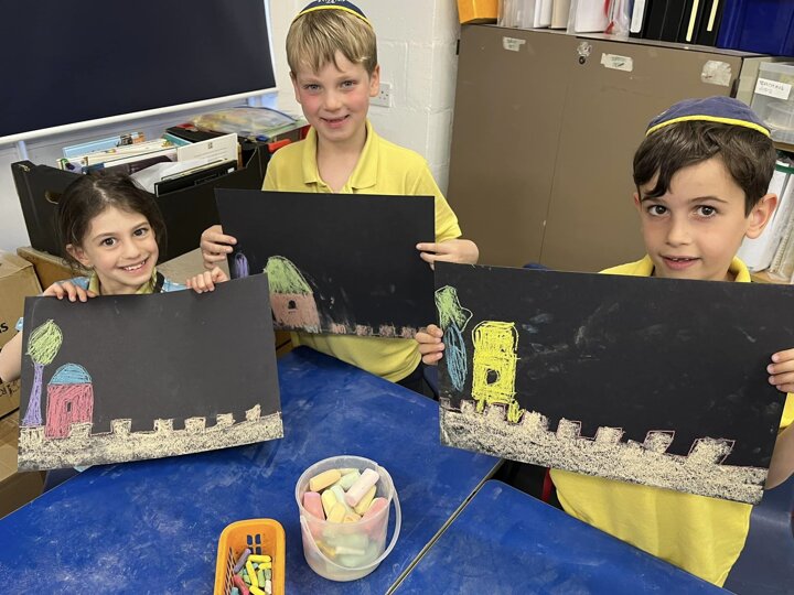 Today is Yom Yerushalayim. All the year groups sang hallel and the hatikva and enjoyed a range of crafts. Here are some year 2 children creating their Jerusalem skyline art. The chalks look particularly effective against the black backdrop.
