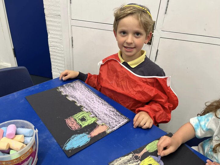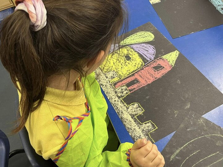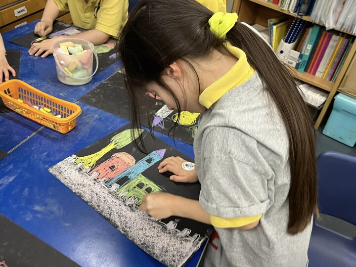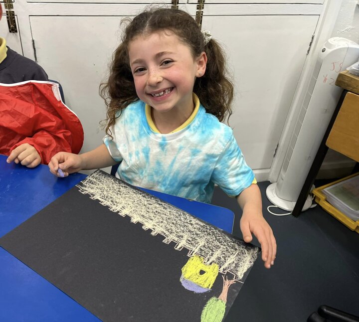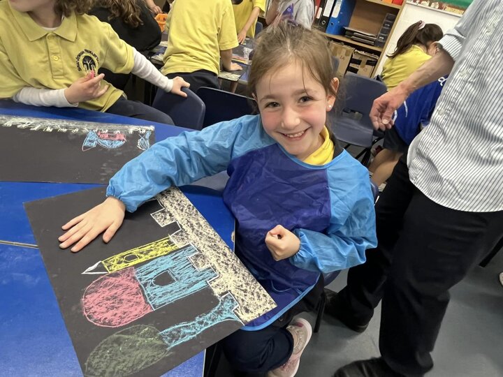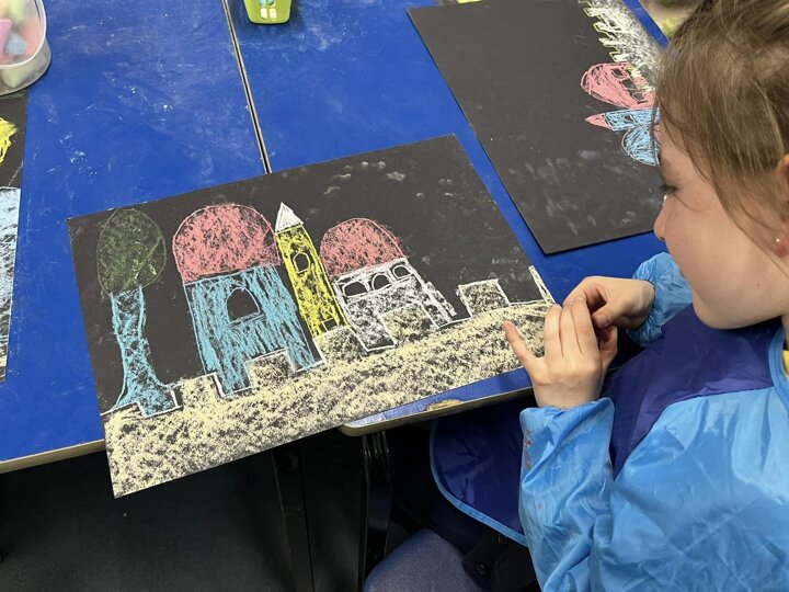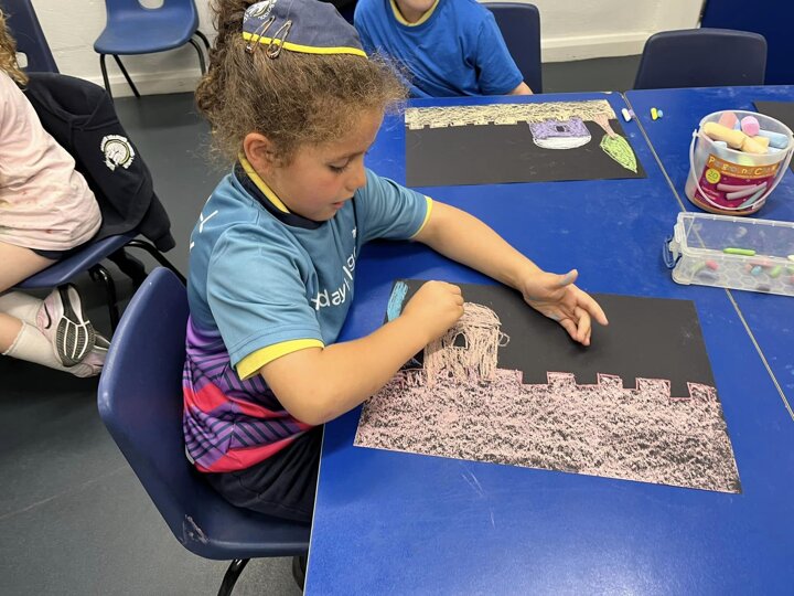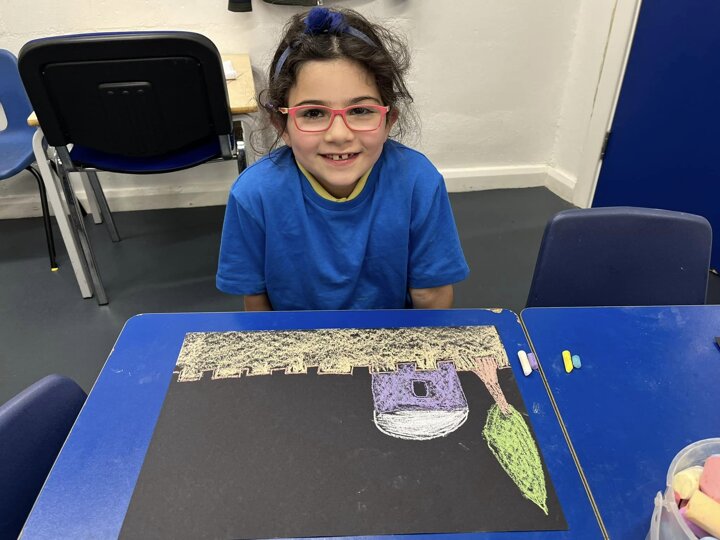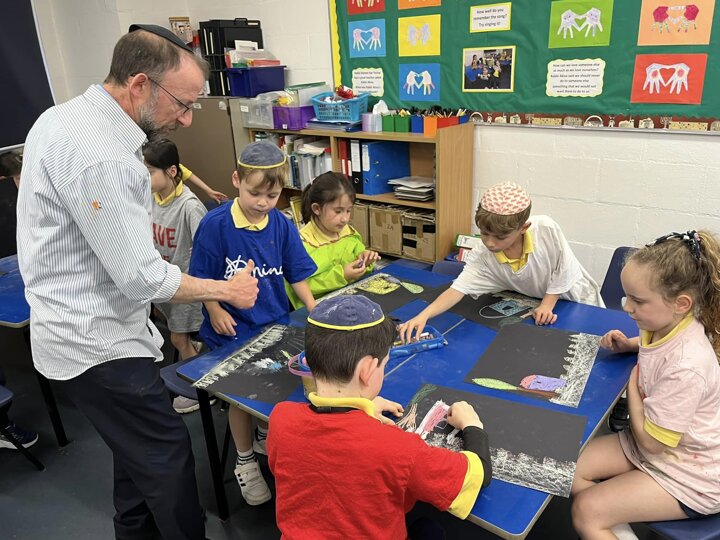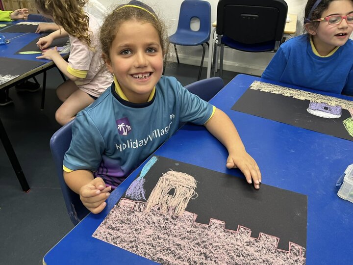 Today is Yom Yerushalayim. All the year groups sang hallel and the hatikva and enjoyed a range of crafts. Here are some year 2 children creating their Jerusalem skyline art. The chalks look particularly effective against the black backdrop.