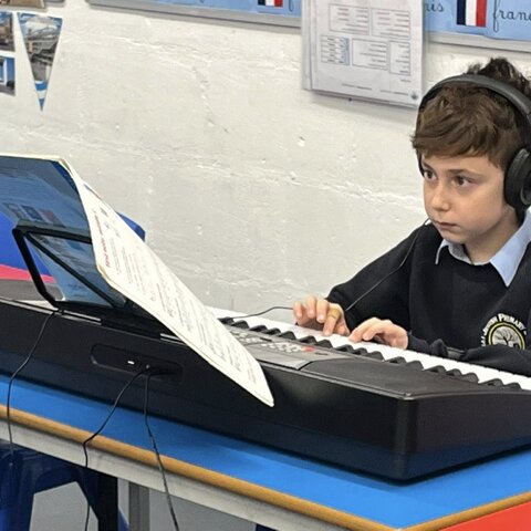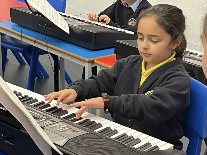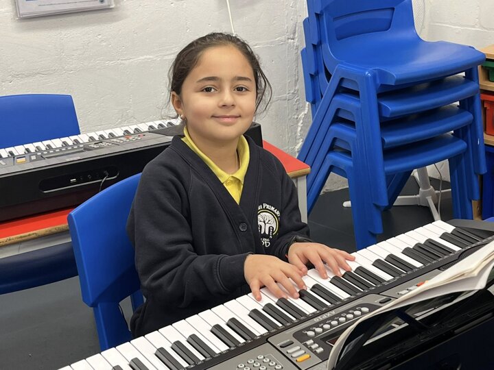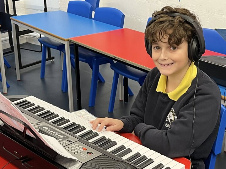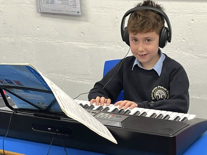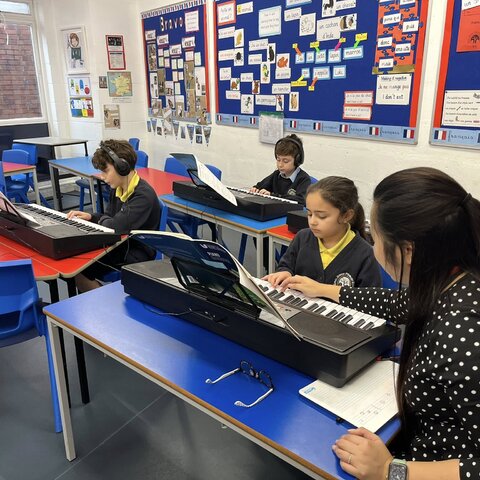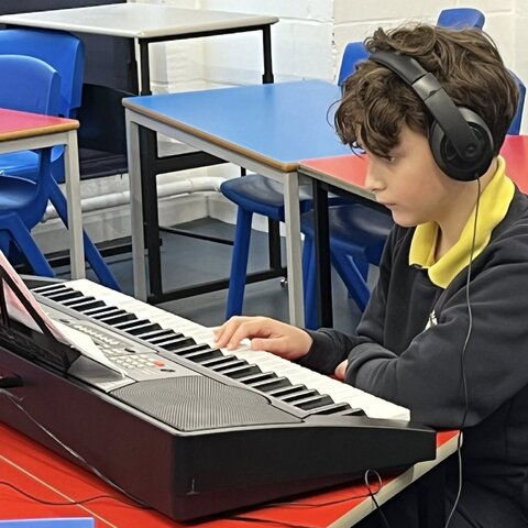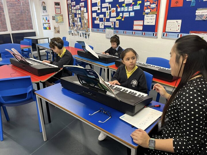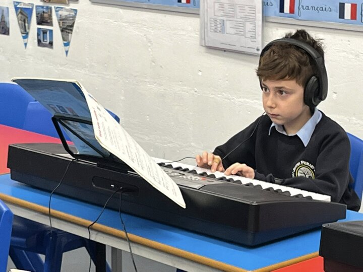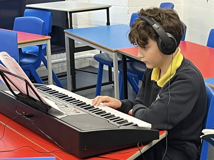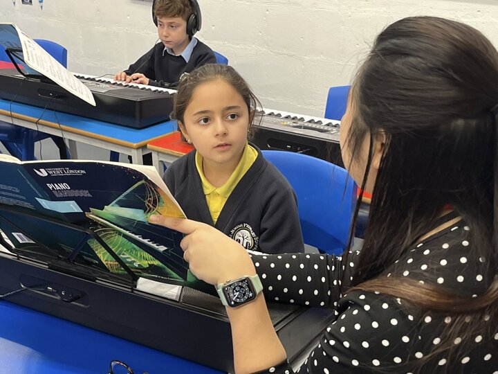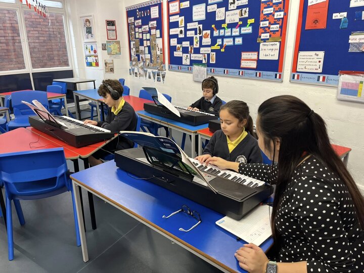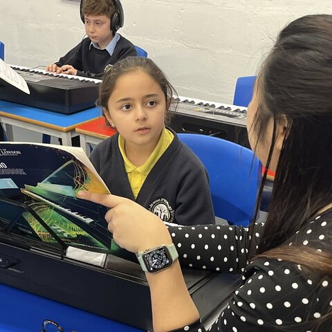 We offer a range of private music lessons at Sinai including keyboard, guitar, violin, clarinet and flute. This is a small group keyboard lesson run through Brent Music Service.
